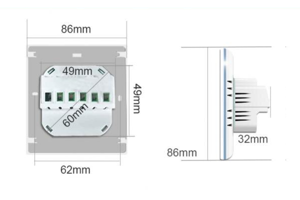 The models have the same recessed housing sliding into the wall, sized 50x50mm, with rounded corners creating a diameter of about 59mm. This makes them suitable for both EU and US wall fixtures. The EU model fits in a properly deployed, standard 60mm round wall box and can be fixed with two side screws (use the screws which belong to the box instead of the ones shipped with the device), the US model fits in the standard rectangular box and can be fixed through the oval holes located 3 1/4" apart. The depth of the wall box has to be at least 35-40mm because some room is needed for the wires coming out straight of the device.
