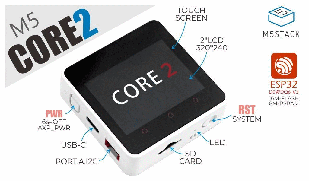 M5Stack core2 is the second generation core device in the M5Stack development kit series. The core2 features a 2" capacitive touchscreen, unlike its predecessor, making it very suitable to run openHASP. The device is packed with a beefy ESP32 model D0WDQ6-V3 and lots of sensors.